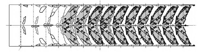 a. 生產(chǎn)效率高。級進模是多任務(wù)工序沖模,在一副模具內(nèi),可以包括沖裁、彎曲成形以及拉伸等多種工序,具有很高的生產(chǎn)率。級進模排樣工序,如下圖所示。